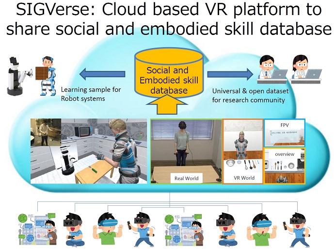 Please refer to the following pages for the latest information. What is SIGVerse †Understanding the mechanism of intelligence in human beings and animals is one of the most important approaches to developing intelligent robot systems. Since the mechanisms of such real-life intelligent systems are so complex, such as the physical interactions between agents and their environment and the social interactions between agents, comprehension and knowledge in many peripheral fields such as cognitive science, developmental psychology, brain science, evolutionary biology, and robotics. Discussions from an interdisciplinary aspect are very important for implementing this approach, but such collaborative research is time-consuming and labor-intensive, and it is difficult to obtain fruitful results from such research because the basis of experiments is very different in each research field. In the social science field, for example, several multi-agent simulation systems have been proposed for modeling factors such as social interactions and language evolution, whereas robotics researchers often use dynamics and sensor simulators. However, there is no integrated system that uses both physical simulations and social communication simulations. Therefore, we have been developing a simulator environment called SIGVerse, which is a simulator that combines dynamics, perception, and communication simulations for synthetic approaches to research into the genesis of social intelligence. In this paper, we introduce SIGVerse, its example application and perspectives. What is SocioIntelliGenesis? †This keyword is innovated by Special Interest Group for SocioIntelliGenesis. We focus on a synthetic research on elucidation of genesis of social intelligence -- physical interaction between body and environment, social interaction between agents and role of evolution and so on --, with aiming to understand intelligence of humans and robots. For such an approach, we have set interdisciplinal discussions with wide viewpoint for various research field such as cognitive science, developmental psycology, brain science, evolutionary biology and robotics. Detail information is available from How to use? †You can download and install the software from https://github.com/SIGVerse/sigverse_unity_project Please refer Tutorial for concrete usage. How to ask questions †Please send your request to Tetsunari Inamura at National Institute of Informatics. Every one can join and ask question through SIGVerse Users Group ML. Please join from here We have also Facebook Users Group page. If you want, please send request from Who develops this system? †P.I. of this project is Dr.Tetsunari Inamura @ National Institute of Informatics. This project is supported by so many collaborators such as SocioIntelliGenesis group. If you have a request for collaborative research project, please contact Dr. Tetsunari Inamura Publication †