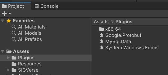 - Drag and drop MySql.Data.dll and Google.Protobuf.dll in the "v4.5.2" folder after unzipping the zip file under [Assets/Plugins] on the [Project] tab of the Unity editor.
