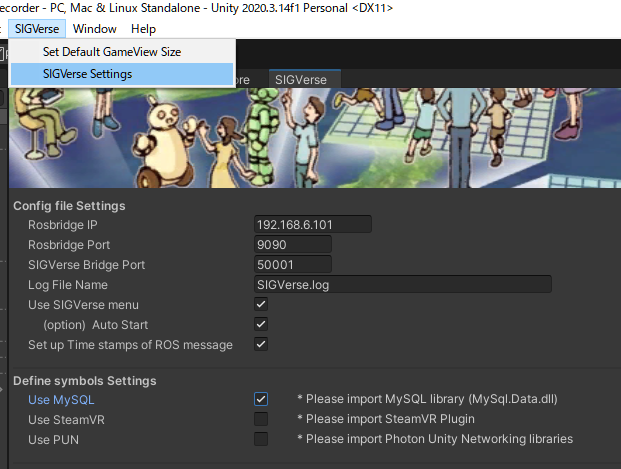 - Click [SIGVerse]-[SIGVerse Settings] in the Unity editor to open the SIGVerse settings screen.