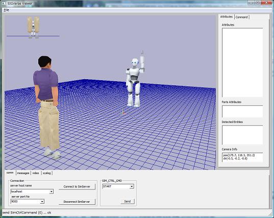 SIGViewerで接続して、シミュレーションを開始するとonInitにより、人型エージェント(メッセージ送信者)が手を下して、後ろを振り返ります。そして5秒に一回ロボット(メッセージ受信者)がメッセージに反応して手を挙げているのがわかります。