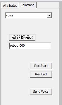 次にSIM_STRL_CMDがSTARTとなっている状態で、"send"ボタンを押してシミュレーションを開始し、右上にあるCommandタブをクリックします。一番上の入力欄はgeneralとvoiceを選択できるようになっています。ここではvoiceを選択します。次に"送信対象選択"ボタンをクリックしてロボット型エージェントをクリックします。次に"Send Voice"ボタンをクリックします。