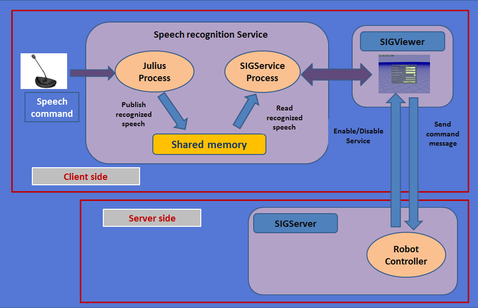 This is the SIGVerse service for speech recognition, its aim is to retrieve the recognized speech from the windows shared memory published by Julius proces and to send it to the SIGVerse controller to control the robot.