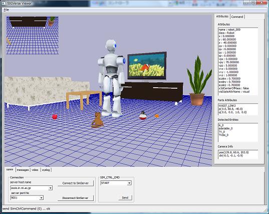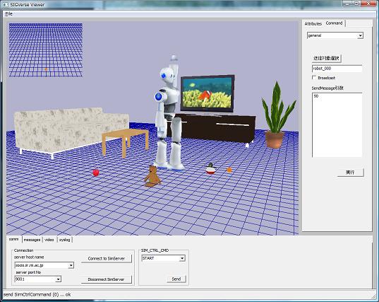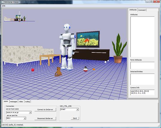 SIGViewerでサーバに接続して、シミュレーションを開始します。リビングルームに立っているヒューマノイドロボット型のエージェントが見えると思います。