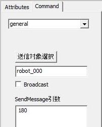 次に右側のコマンドタブをクリックして、ヒューマノイド型ロボットのエージェントに回転する角度を指定して、実行ボタンを押し、メッセージを送信します。例えば180を送信します。
