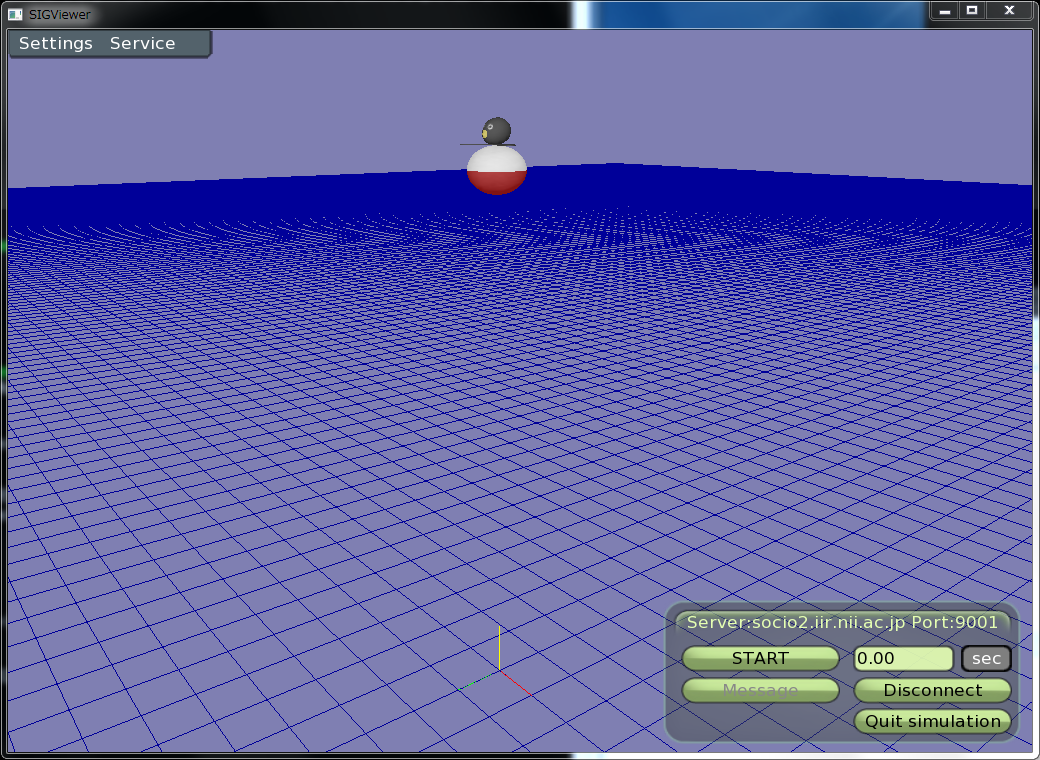 xmlファイルの中で今回作成したコントローラを指定したので、SIGVerseの起動と同時に自動的にエージェント"Toy_D"にアタッチされました。 次にSIGViewerを起動して接続するホスト名とポート番号を入力し、"Connect"ボタンをクリックしてサーバに接続します。