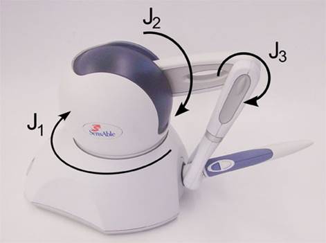 The Phantom has 6 joints (see figure 1 and 2), with each joint capturing the degree of the inclination. Joints numbers 1 to 3 are equipped with 3 resistance motors, one by axis (x, y, z) so the device can apply feedback in space.