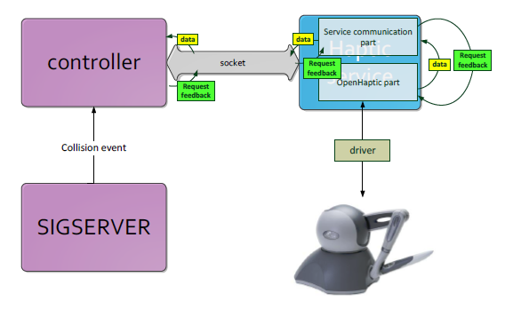 When a collision or the end of a collision is detected, the controller sends the needed information (loaded from the entity collided) like feedback force type and their intensity to the Haptic service (green part on figure 4).