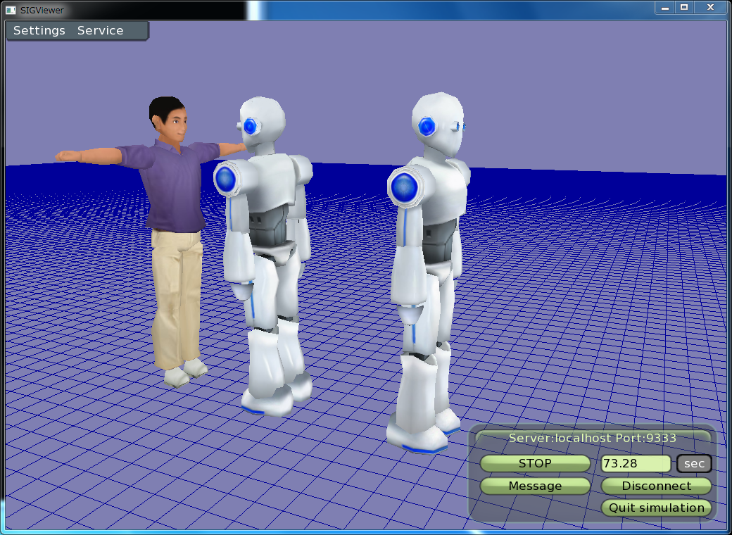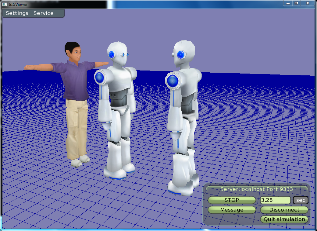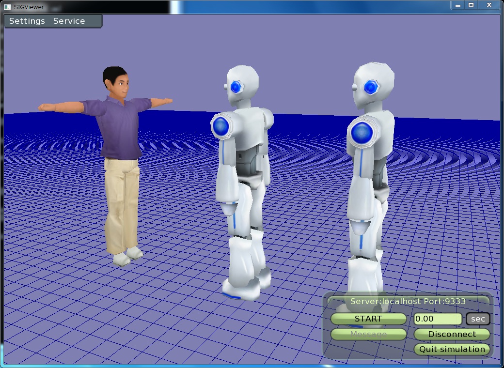 サーバに接続するとロボットが2体いて、人間が通せんぼしているのがわかります。 それではシミュレーションを開始してみましょう。