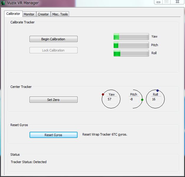 次に"Begin Calibration"のボタンを押してキャリブレーションを開始します。 様々な方向にHMDを回転させます。いくら回転しても右のYaw, Pitch, Roll のバロメータが動かなくなったら"Lock Calibration"のボタンを押してキャリブレーションを終了させます。