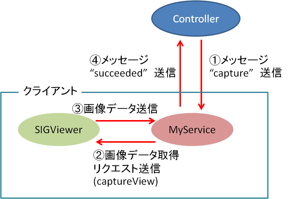 このサービスプロバイダは"capture"というメッセージを受け取るとViewerにcaptureViewリクエストを送りカメラ画像データを取得します。そしてcaptureViewに成功すると"succeeded" というメッセージをコントローラに返します。