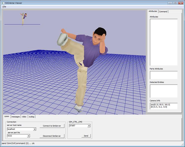 SIGViewerでサーバに接続するとエージェントが手を広げて立っているのが見えます。 Sendボタンを押してシミュレーションを開始するとbvhファイルの読み込みが開始され、エージェントが動き始めます。
