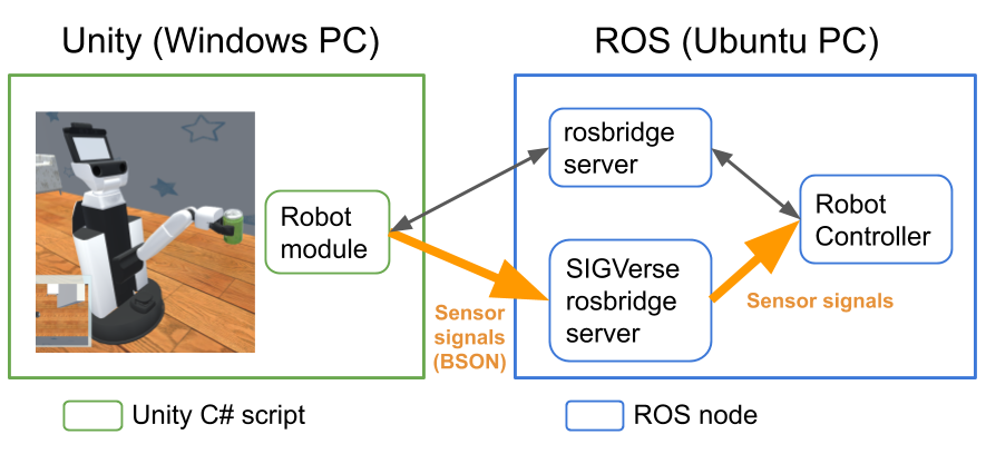 This page explains how to control a virutal robot in SIGVerse based on ROS. The virtual robots are working under the Unity. SIGVerse uses ROS bridge and SIGVerse-ROS bridge to communicate your software in ROS side to SIGVerse system as shown in the following figure.