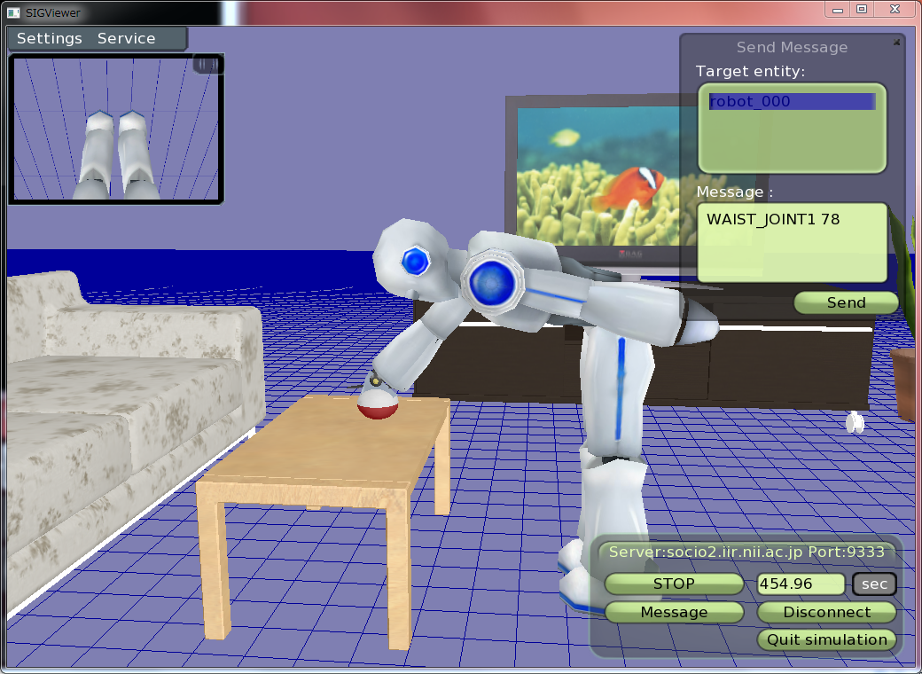 You can control the avator wich messages such as "move", "rotation" and "[joint name] [angle]". Let's make the avator touch on something object by the right hand. If the agent touch on a certain object, the object will be grasped.