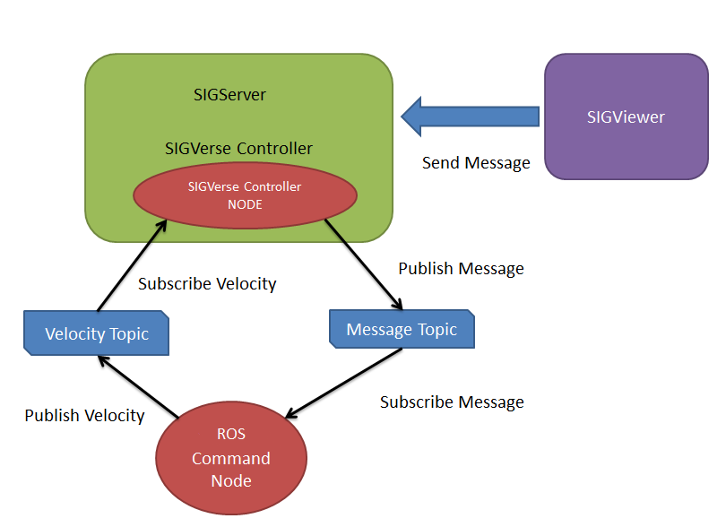 In order to integrate SIGVerse and ROS You need to build the following basic system. First, we need to create two ROS packages, SIGVerse controller and ROS command package which will run as nodes. The first node, SIGVerse controller node, will receive data from the SIGViewer as messages, which will publish them on the message topic, in the other part, ROS command node receives reads these data and subscribe the convenient velociy on the velocity topic, the velocity command will be retrieved by the SIGVerse controller node to be used for controlling the robot.