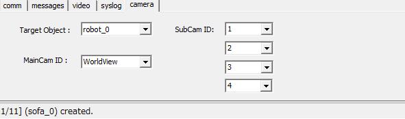 "camera"タブから左の4つのビューポートに映すカメラを切り替えることが出来ます。 まず、カメラを表示したいエージェントをクリックします。すると"Target Object:"のところにクリックしたエージェントの名前が表示されます。
