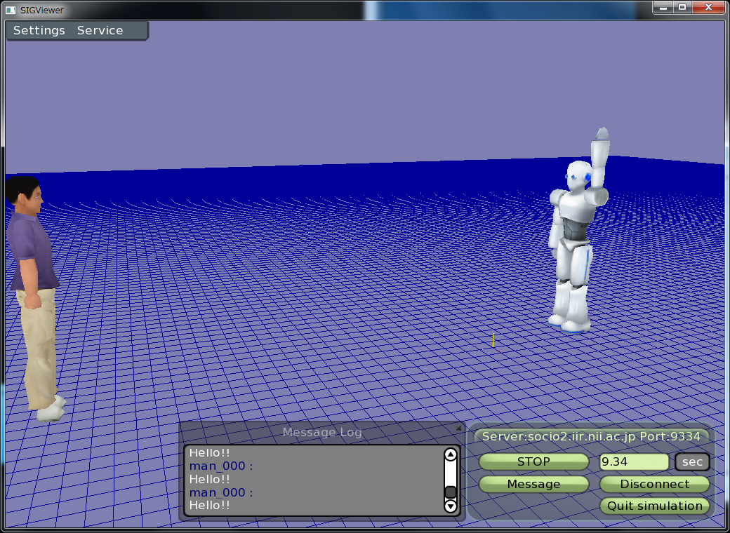 If the broadcastMsg is used, the message will be reached to all of the agents, SIGViewer and SIGVerse services. The SIGViewer will show the received message as log message.