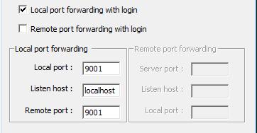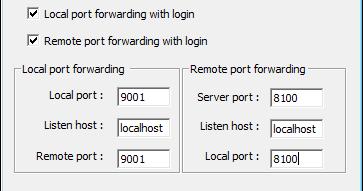 この設定により、ビューワーはサーバに対し、SSHによるトンネリングを利用してリクエストを送信することができるようになります。 "Local port forwarding with login"にチェックを入れた状態で、以下の3つの項目に入力します。