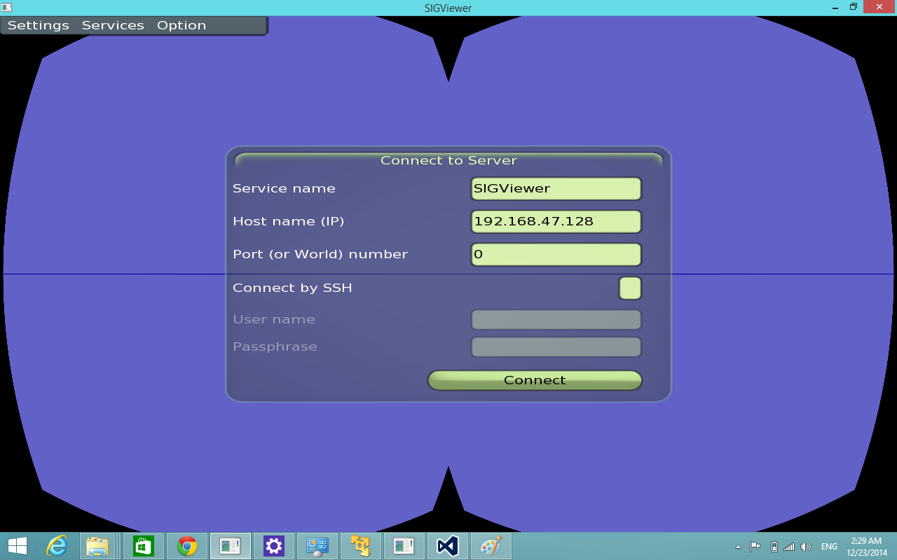 Start the SIGViewer and enter the host name and port number to connect to the SIGServer . Please use the button "Connect to SIGServer" by single click.
