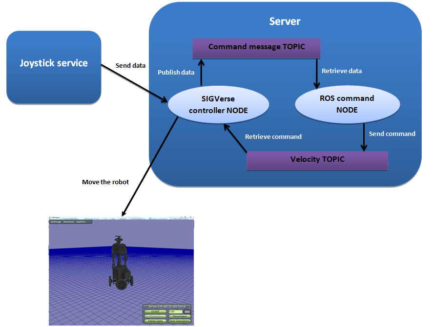 When the server is launched, 2 ROS nodes are created, the SIGVerse controller node and SIGVerse command node, this involves the creation of 2 topics, command message topic and velocity topic. In the other part, the joystick service sends data to the SIGVerse command node which will publish it on the command message topic, then, the SIGVerse controller node receives the data, processes it, then publishes the command on the velocity topic, finally the SIGVerse command node receives the command and send it to the robot.