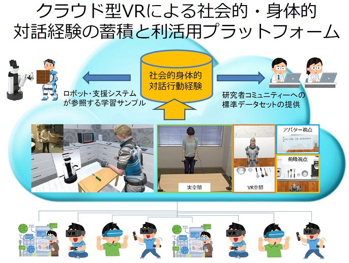 最新情報は以下のページを参照してください。 このウェブは,社会的知能発生学シミュレータ(SIGVerse ™)の情報を発信するページです. (SIGVerse™のコンセプトイメージ:この図を含め,本ページの内容の無断再利用はできませんので,ご注意下さい) SIGVerse™とは? †人間とロボットが言語的・物理的・認知的インタラクションを行いながらタスクを達成するという状況を扱う研究分野はHuman-Robot Interactionと呼ばれ,近年のロボット研究の大きなトピックになっています.例えば,部屋の片付けをする家庭用サービスロボットなどが典型的な例になりますが,そのような研究を実施するには,研究室にリビングルームを設置し,ロボットを購入または開発し,長時間の被験者実験などを繰り返すなど,空間的・予算的・時間的コストが膨大にかかります.それを手軽にシミュレーションの世界で実現し,大学の研究者でなくとも研究を進めることが可能な環境を提供するのがSIGVerseです.仮想ロボットがシミュレータの中で動作するだけでなく,現実世界の人間がバーチャルリアリティーのデバイスを介して,ロボットと言語的・身体的・認知的インタラクションをリアルタイムで行うことが可能です.これにより,OpenAI GymやDeepMind Labなどのような,実機のロボットを使わずに機械学習アルゴリズムとシミュレータのみでロボットの運動スキルを獲得させるような研究を,Human-Robot Interactionの分野でも実施できる可能性が広がります. 詳細については,逐次学会等で発表を行って行きます.発表についてはこちらのページをご覧下さい. どうすれば使えるの? †GitHub でインストーラを公開していますこちらのページからダウンロードをお願いします 質問がしたい †