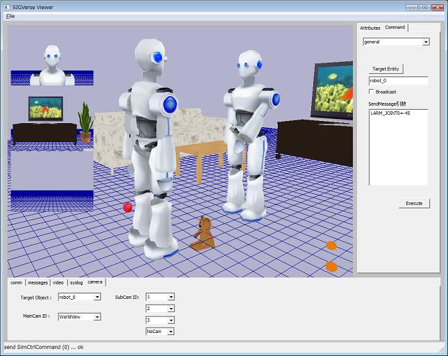 Up:Tutorial? Previous:視覚に関する操作 Next:エージェント視点の画像取得 複数個のカメラを設置する方法 †ヒューマノイド型のエージェントはデフォルトでは顔に一つだけカメラが設置されていますが、複数個のカメラを体の好きな場所に取り付けることができます。ここではエージェントに複数個のカメラを設置する方法を説明します。なお、ヒューマノイド(関節を持ったエージェント)以外のエージェントはカメラを増やすことはできません。(SIGViewer1.3.5以降のバージョン対応) サブカメラを設置する †エージェントにサブカメラを設置するサンプルコードを紹介します。 コントローラ作成 †$ cd ~/sigverse-<version>/bin/NewWorld $ emacs SetCamera.cpp SetCamera.cpp このエージェントはメッセージ"move"を受信すると現在向いている方向に進みます。"rotation"を受信するとエージェントは向きを変えます。回転する角度をメッセージとして受信して、その角度だけ体を回転します。また、"「関節名」=「角度」"というメッセージを送信するとエージェントは関節を指定した角度に曲げます。 それではコンパイルします。 $ emacs Makefile 変更前 #オブジェクトファイルの指定 OBJS = WatchController.so 変更後 #オブジェクトファイルの指定 OBJS = SetCamera.so $ make リビングルームの世界ファイル作成 †世界ファイルは前節(視覚に関する操作)で使用したリビングルームの世界ファイルとほとんど同じものを使います。 $ cd ~/sigverse-<version>/bin $ emacs xml/MultiCamera.xml MultiCamera.xml サブカメラを設置するリンクの名前を(elnk1, elnk2, elnk3, ... , elnk9)で設定します。 また、ヒューマノイド以外のエージェント(seDoll_Bear.xml)にもカメラを設置していますが、この場合はカメラを設置するリンク名を指定する必要はありません。カメラの位置、方向は(vpx,vpy,vpz), (vvx,vvy,vvz)で設定します。 起動 †それでは起動してみましょう。 $ ./sigserver.sh -w MultiCamera.xml -p 9001 SIGViewerでサーバに接続して、シミュレーションを開始します。リビングルームに向かい合って立っている2体のヒューマノイドロボット型のエージェントが見えると思います。 SIGViewerで接続してみるとリビングルームにロボットが立っているのが見えます。 ロボットをクリックするとロボットにつけられたカメラから映し出された画像が左側のサブカメラに表示されます。 "start"ボタンを押してシミュレーションを開始して、SIGViewerからエージェントに"rotation"や"move"などのメッセージを送信してエージェントが向きを変えたり、移動したりすることを確認してみてください。ロボットを動かすと左の画像でサブカメラの視線がつられて動いているのがわかると思います。 サブカメラの切り替え †"camera"タブから左の4つのビューポートに映すカメラを切り替えることが出来ます。 まず、カメラを表示したいエージェントをクリックします。すると"Target Object:"のところにクリックしたエージェントの名前が表示されます。 "SubCam ID:"は上からビューポート1、ビューポート2、ビューポート3、ビューポート4に対応しており、それぞれ好きなカメラ番号で映し出される画面を表示することができます。 メインビューの切り替え †Viewerにメインで表示されている画面をエージェントに取り付けられたカメラからの画面に切り替えることができます。 メインビューで表示したいエージェントをクリックし、cameraタブの"MainCam ID:"をカメラ番号(ヒューマノイド以外の場合はAgentView)を指定するとメインビューがエージェントのカメラ視点に切り替わります。 メインビューを"Robot_1"のカメラ1の画像に切り替えました。 WorldViewに戻すと元の画面に戻ります。 ここではロボットに複数のカメラを設置しましたが人間型エージェントでも同じことが行えます。 Up:Tutorial? Previous:視覚に関する操作 Next:エージェント視点の画像取得