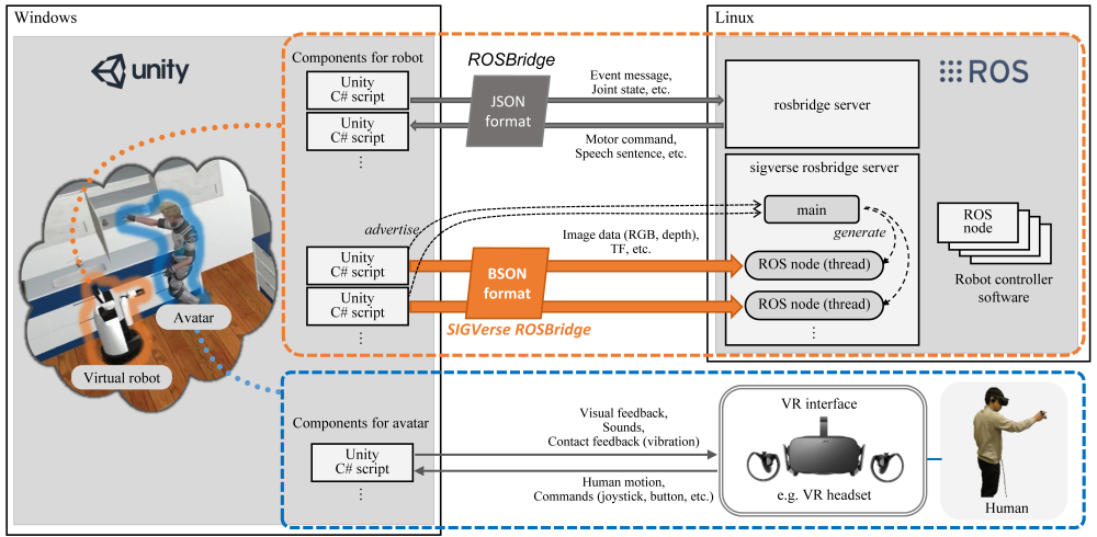 VRデバイスを使用して人間が仮想世界にログインし、仮想世界でロボットとコミュニケーションを取ることも可能です。