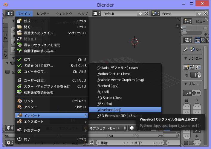 blenderを起動して,ファイル->インポート->Wavefront .obj)をクリック.