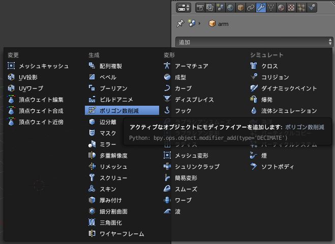 スパナのマーク(モディファイアー)をクリックして「ポリゴン数削減」をクリックします.