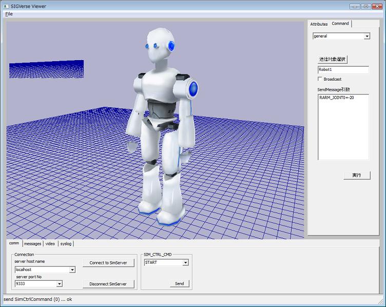 SIGViewerでサーバに接続してシミュレーションを開始します。するとヒューマノイドロボットがバランスを取りながら立っているのが見えます。