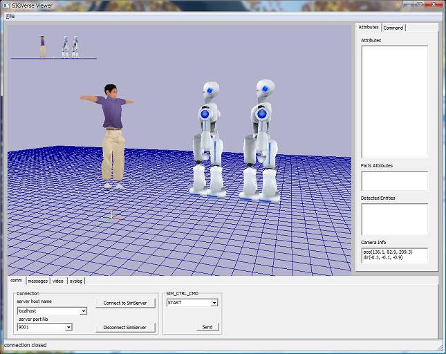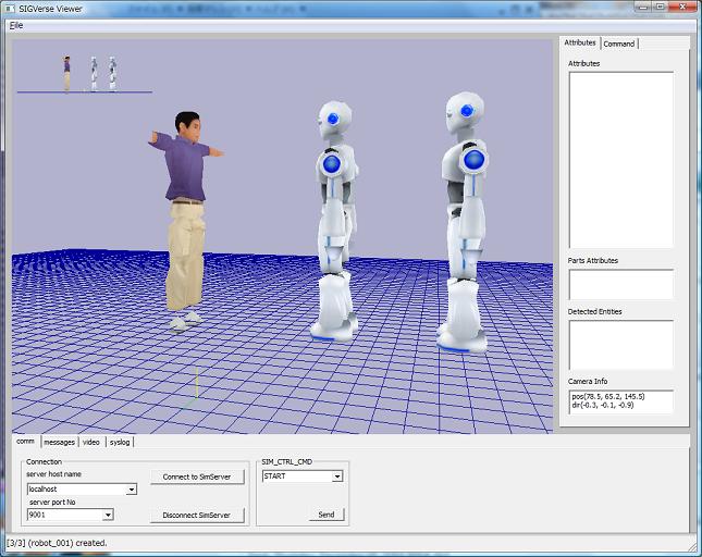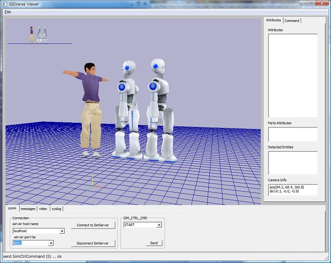 サーバに接続するとロボットが2体いて、人間が通せんぼしているのがわかります。 それではシミュレーションを開始してみましょう。