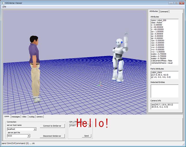 SIGViewerで接続して、シミュレーションを開始するとonInitにより、人型エージェント(メッセージ送信者)が手を下して、後ろを振り返ります。そして5秒に一回ロボット(メッセージ受信者)がメッセージに反応して手を挙げているのがわかります。