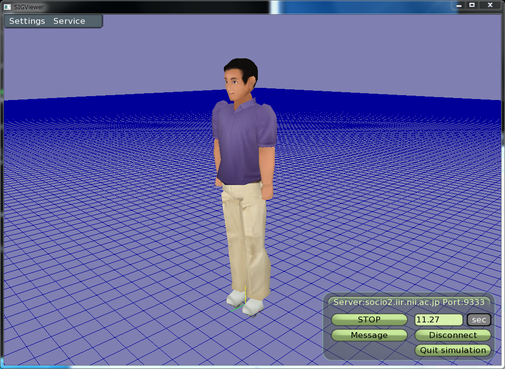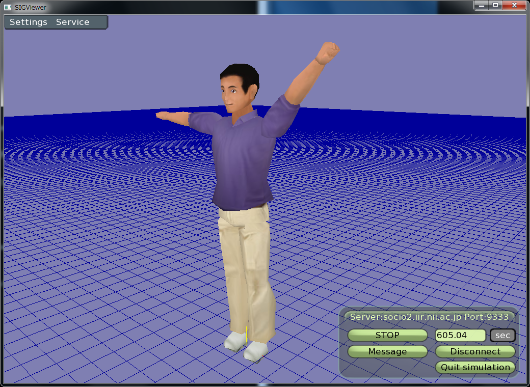 SIGViewerを起動して見てみると人間のエージェントが手を広げてスタンバイしていると思います。 シミュレーションを開始するとエージェントの左腕が45°上がります。