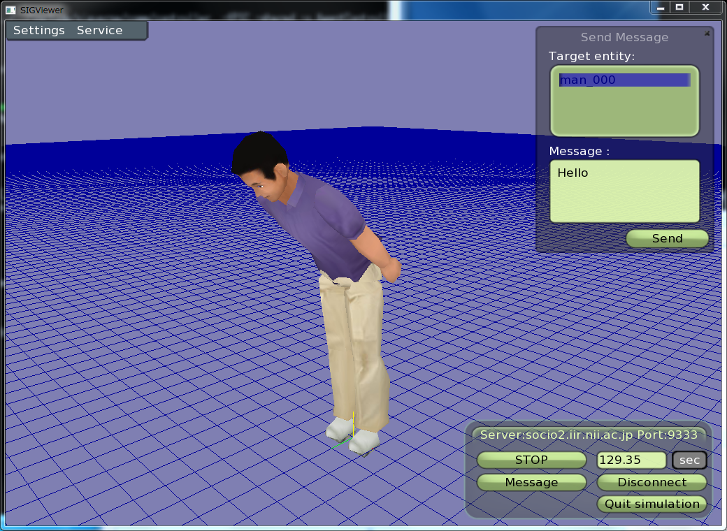 まずSIGViewerの右下にあるMessageボタンをクリックします。 するとSendMessageトレイが現れます。TargetEntityでメッセージを送信するターゲット"man_000"を選択します。次にMessage:のところで"Hello"と入力します。