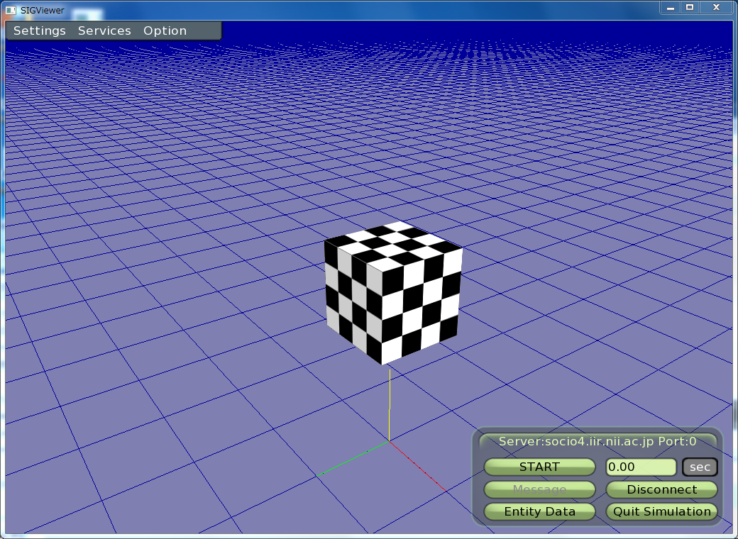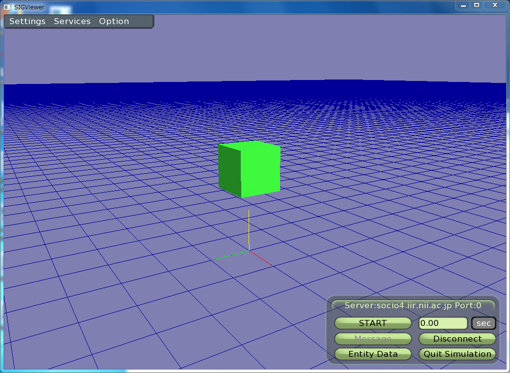 SIGViewerでサーバにつなげてみると緑色の箱が見えます。