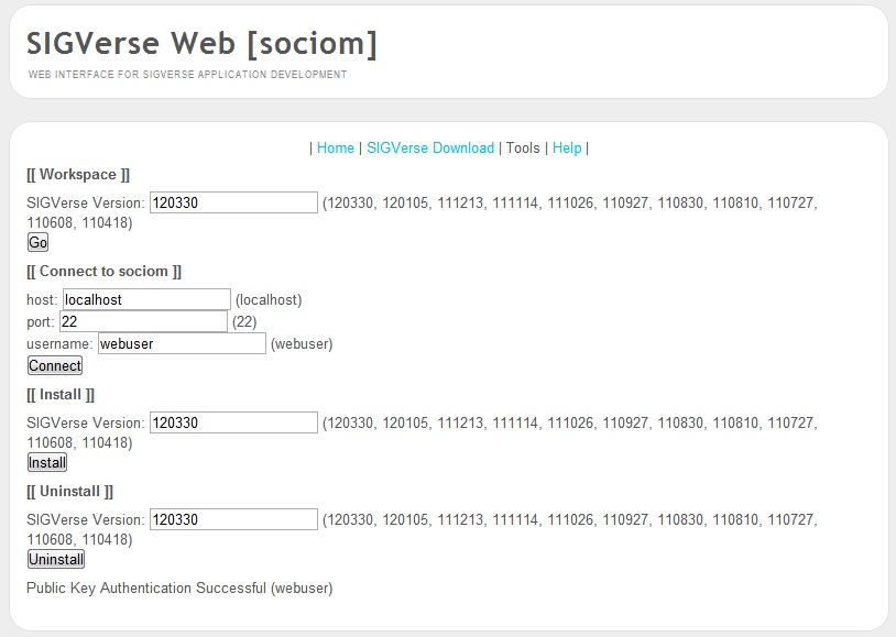 - 上記の中央のエリアの"Member login"からログインして下さい.ログインの後,あなたのワークスペースにSIGVerseサーバをインストールします.このSIGVerseサーバを修正・変更していくことで,あなたの実行したい実験の世界を作ることになります.別の言い方をすると,他人が作ったSIGVerseの世界を用いる場合には,このインストールは必要無い,という事になります.