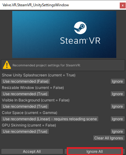 - Valve.VR.SteamVR_UnitySettingsWindowで[Ignore All]をクリックします。