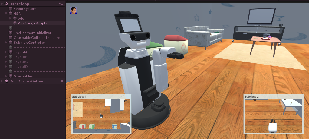こちらを参考に[Assets/SIGVerse/SampleScenes/HSR/HsrTeleop(.unity)]シーンを開始します。