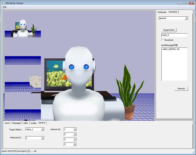 "start"ボタンを押してシミュレーションを開始して、SIGViewerからエージェントに"rotation"や"move"などのメッセージを送信してエージェントが向きを変えたり、移動したりすることを確認してみてください。ロボットを動かすと左の画像でサブカメラの視線がつられて動いているのがわかると思います。