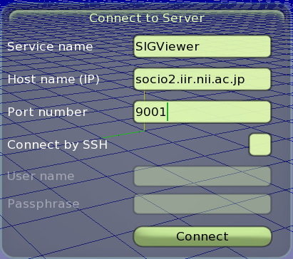 次にSIGViewerを起動して接続先のホスト名、上で起動したポート番号を入力して、"Connect"ボタンを押してサーバに接続します。