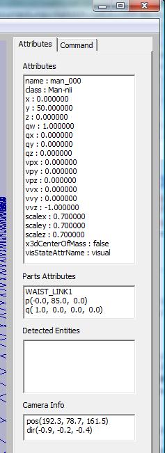このエージェントさまざまなパーツからできていて、それらを関節でつないでできています。SIGViewerでエージェントをクリックするとエージェントの名前や位置などの属性を見ることができます。さらにさまざまなパーツをクリックするとその属性を見ることができます。