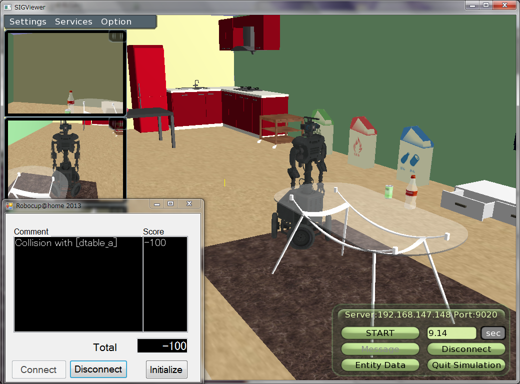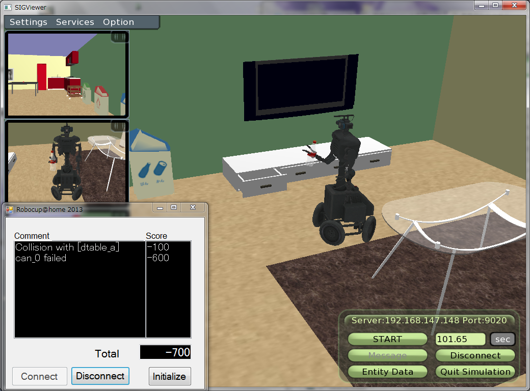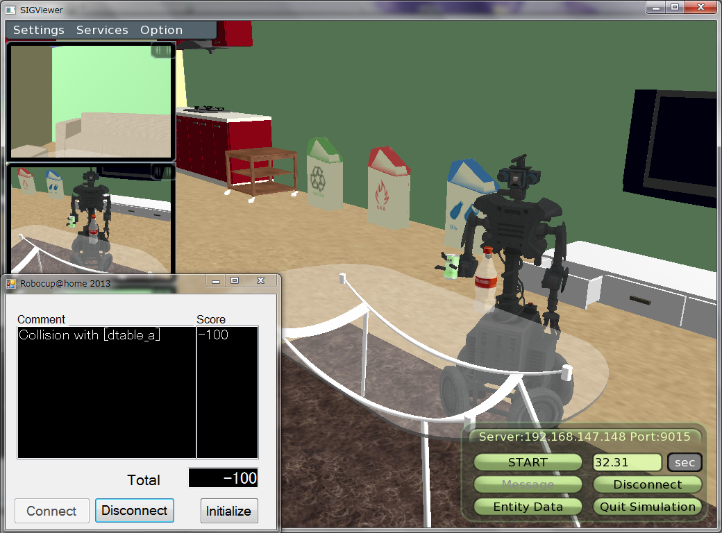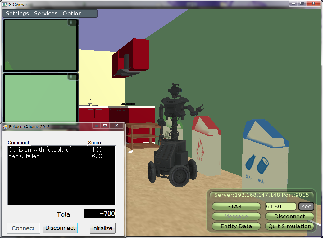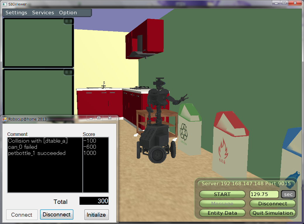 また、後述するレフェリーサービスにより、ロボットが障害物と接触した、誤ったゴミ箱にゴミを捨てた場合には減点、正しいゴミ箱にゴミを捨てた場合には加点されます。