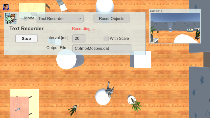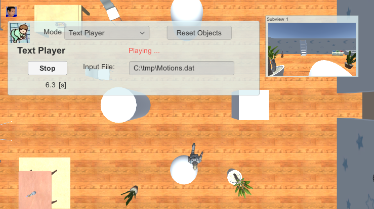 本シーンでは、キャラクター及び幾つかのオブジェクトの動きをテキストファイルへ記録・再生することができます。