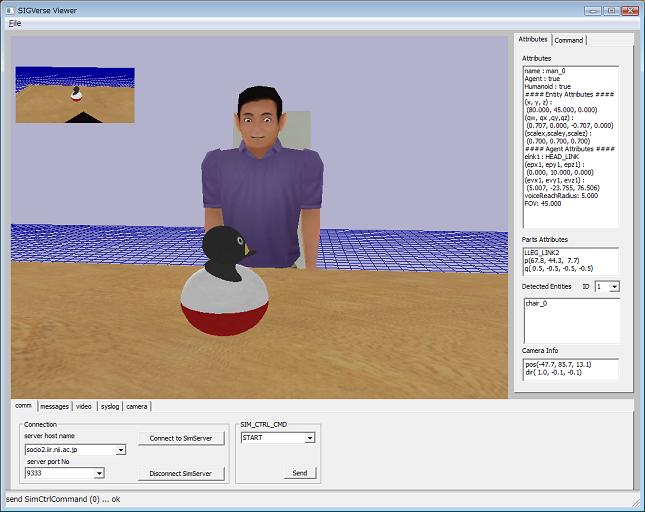 シミュレーションを開始してみると以下のようにテーブルの上にペンギンが乗っていてそれを人間エージェントが見つめています。